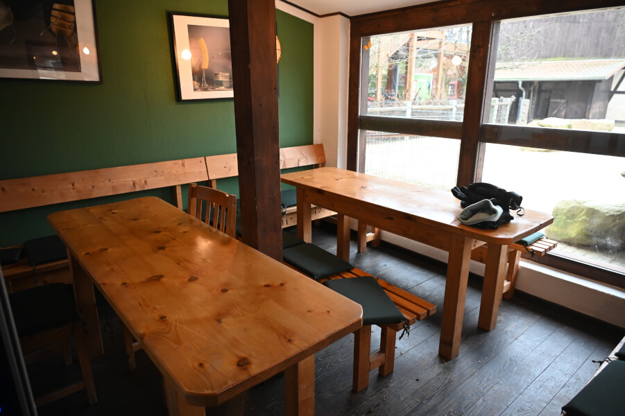 Wie weiter oben bereits erwähnt, ist der gesamte Tierpark Görlitz absolut familienfreundlich gestaltet. Der große Rundweg ist seit dem Bau der Brücke zwischen Vogelvolieren und Kängurus auch gut mit dem Kinderwagen befahrbar. Beim Imbiss gibt es einen ganzjährig geöffneten Aufenthaltsraum mit Mikrowelle sowie Snack- und Getränkeautomaten. Wir haben dort im alten Januar eine kuschelig warme Mittagspause verbracht und unser mitgebrachtes Essen gemampft. Für längere Ruhepausen stehen zusätzlich Stifte, Ausmalbilder und Bücher bereit.